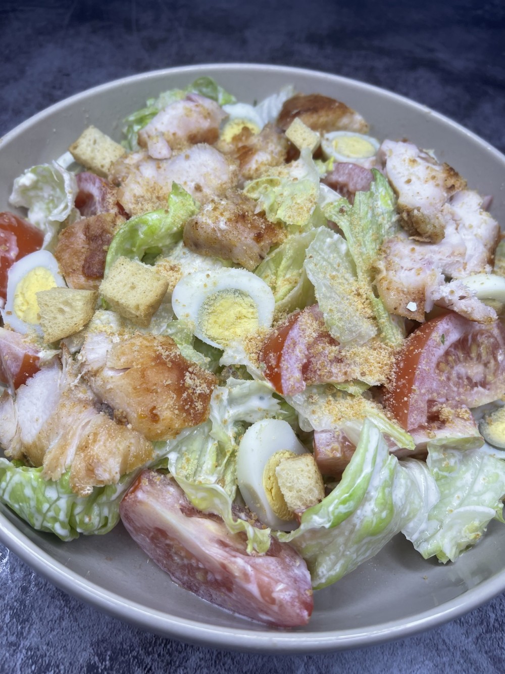 Айсберг, помидоры, курица, сухарики, соус цезарь.