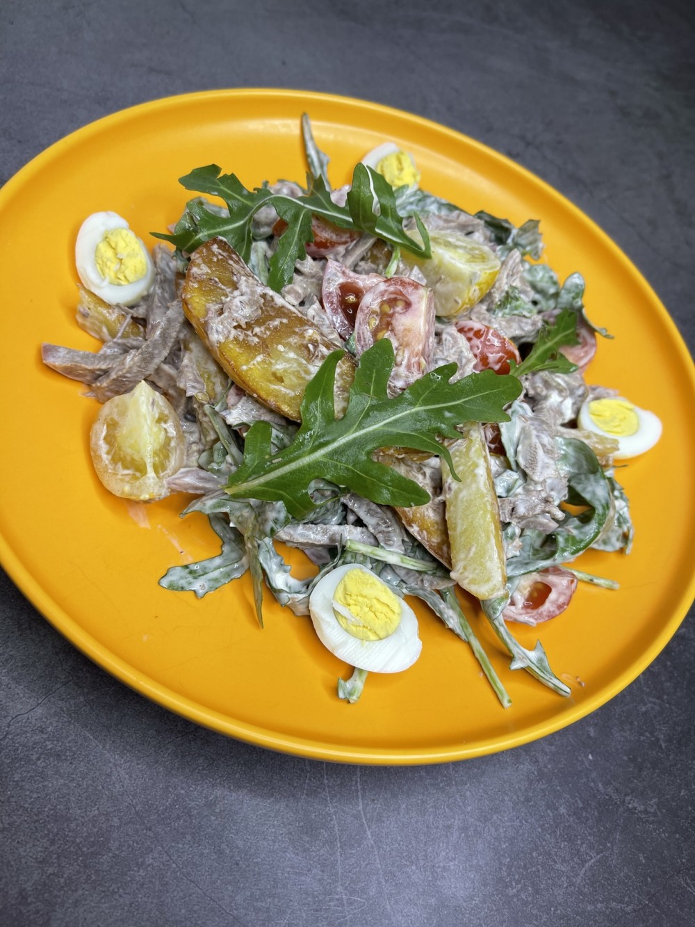 Жая, язык, рукола, черри, перепелинные яйца, картофельные дольки, соус айоли.