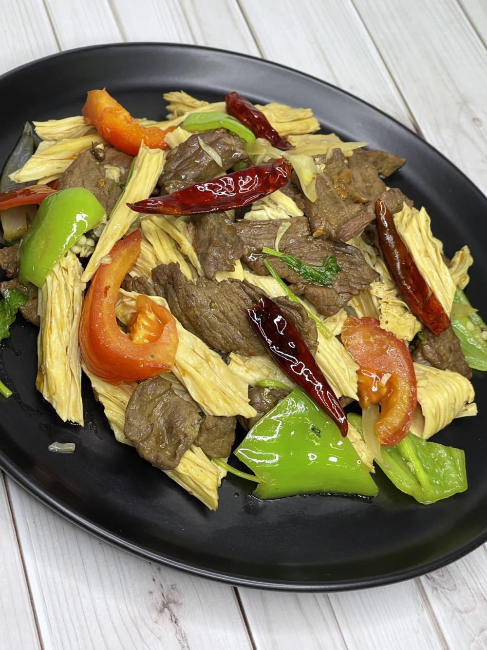 Теплый салат из спаржи по-Дунгански. Телятина, спаржа, овощи, специи и приправы.