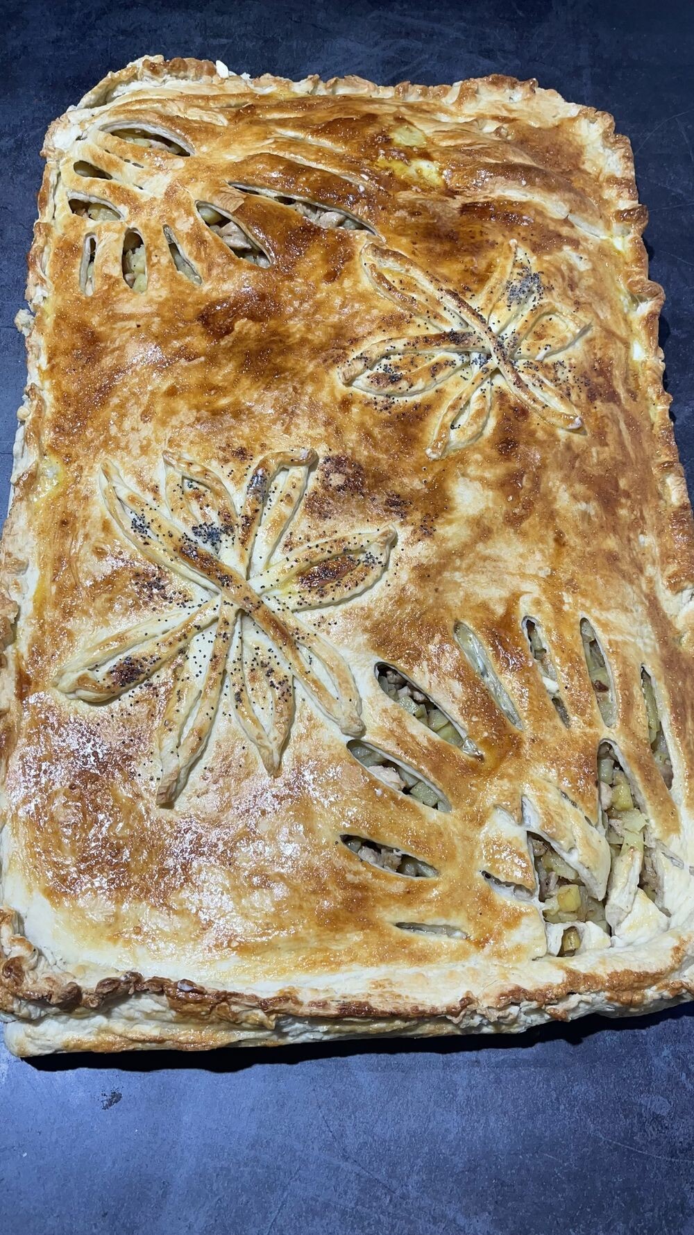 Слоеное тесто, курица, картофель. Размер пирога 40/60 см.