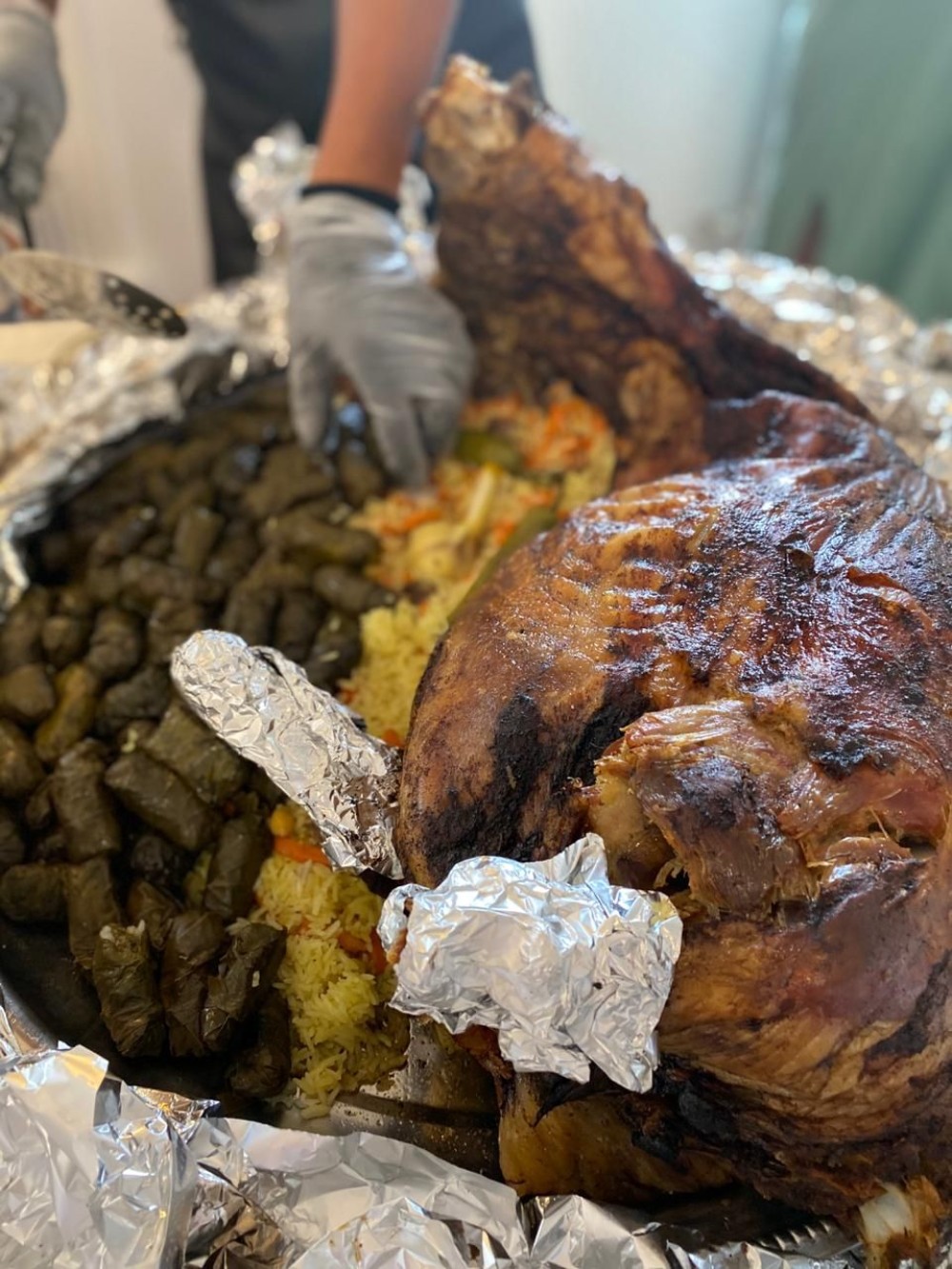 Ягнёнок запеченый в тандыре, фаршированый пловом и долма. Вес ягнёнка 18 кг.+ 6 кг. плова с говядиной+ 100 шт. долма+ 500 мл. соуса + 5 тандырных лепешек. На 30+ персон.