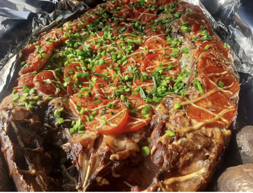 Сазан весом 6 кг., приготовленный в коктальнице на вишнёвых щепках с печёным картофелем.