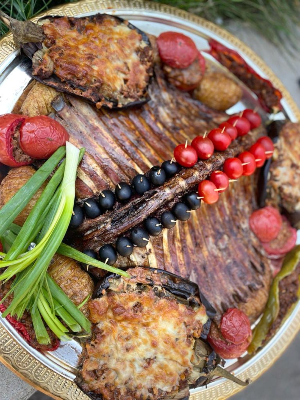 Рёбрышки ягнёнка и антрекот, запечённые в тандыре. Подаются с фаршированными телятиной баклажанами под сыром, фаршированными томатами и перцами, запечённой картошечкой, мацони и острым соусом. На 8-10 персон.