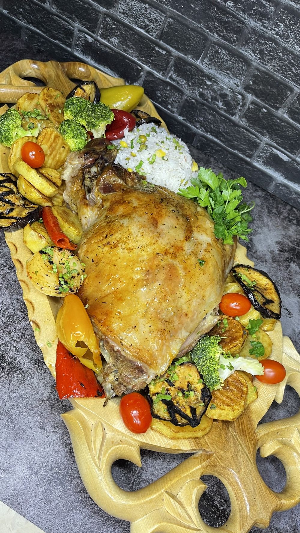 Запечённый в тандыре окорок ягнёнка, весом 3,5 кг., с гарниром из овощей, запечённого картофеля и риса. К блюду подаётся красный соус и лепешка.на 7-8 персон.