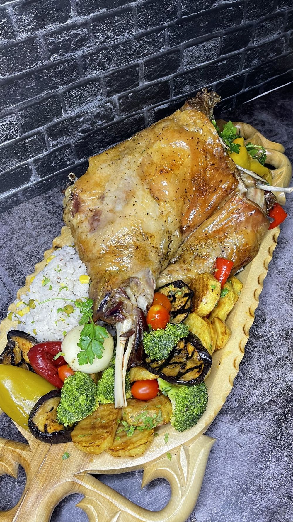 Запечённый в тандыре бок и передняя нога весом 3,5 кг., с гарниром из овощей, запечённого картофеля и риса. К блюду подаётся красный соус и лепешка. На 7-8 персон.