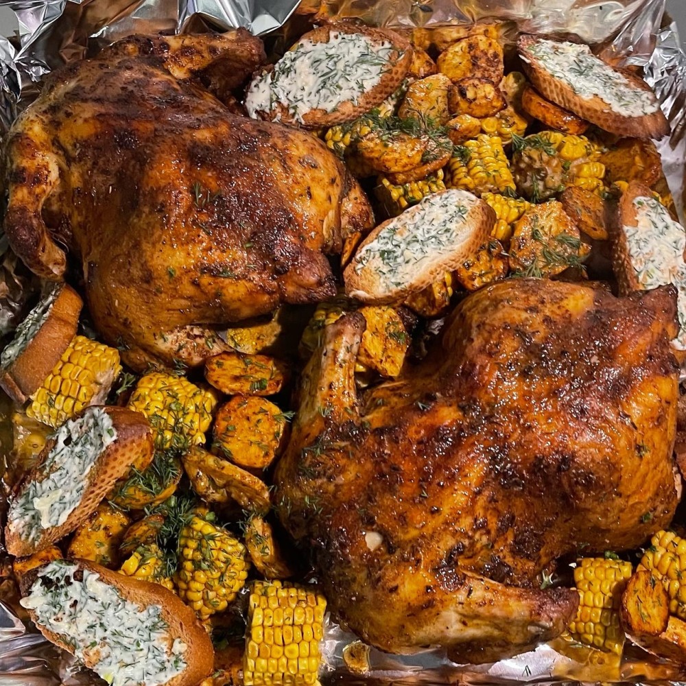 2 домашних бройлерных цыпленка ( 2,5 кг каждый) по-каджунски. Картофельные слайсы 1,5 кг и сладкая кукуруза. Микс салат из сезонной зелени и овощей бонусом. Брускеты с сыром, чесноком и зеленью.