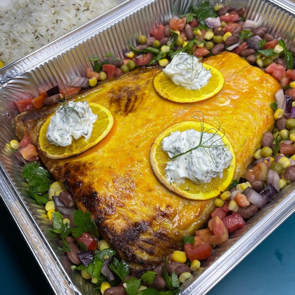 1. Филе лосося, запечённое в апельсиновом соусе . 2. Гарнир из красной фасоли, горошка, кукурузы, свежих томатов и зелени. 3. Рис 4. Микс салат из сезонной зелени и овощей.