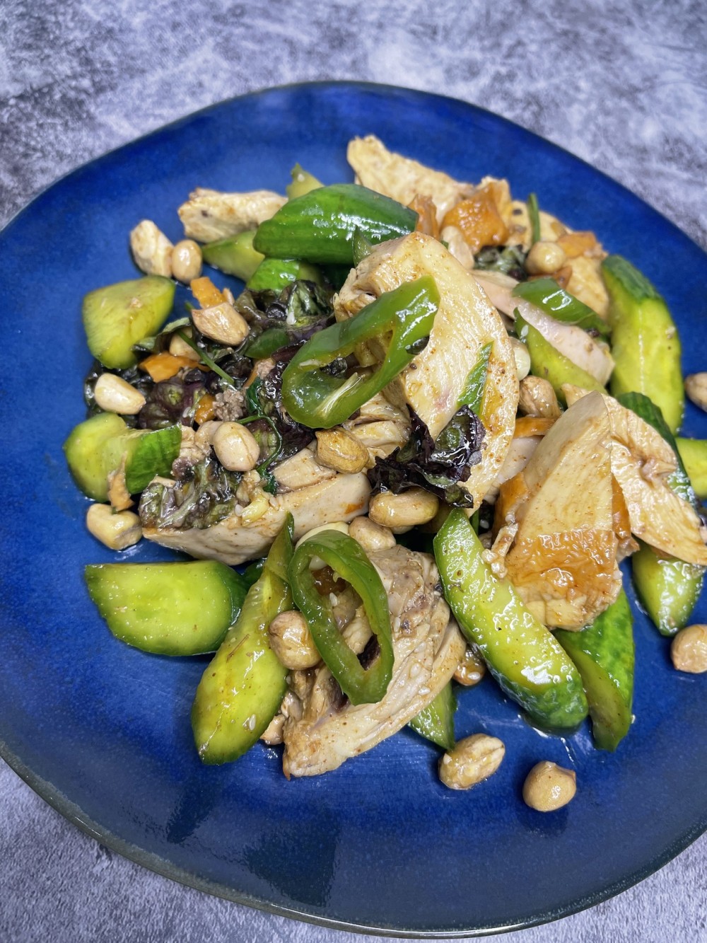 Филе курицы, огурцы свежие, арахис, чили, специи и приправы.