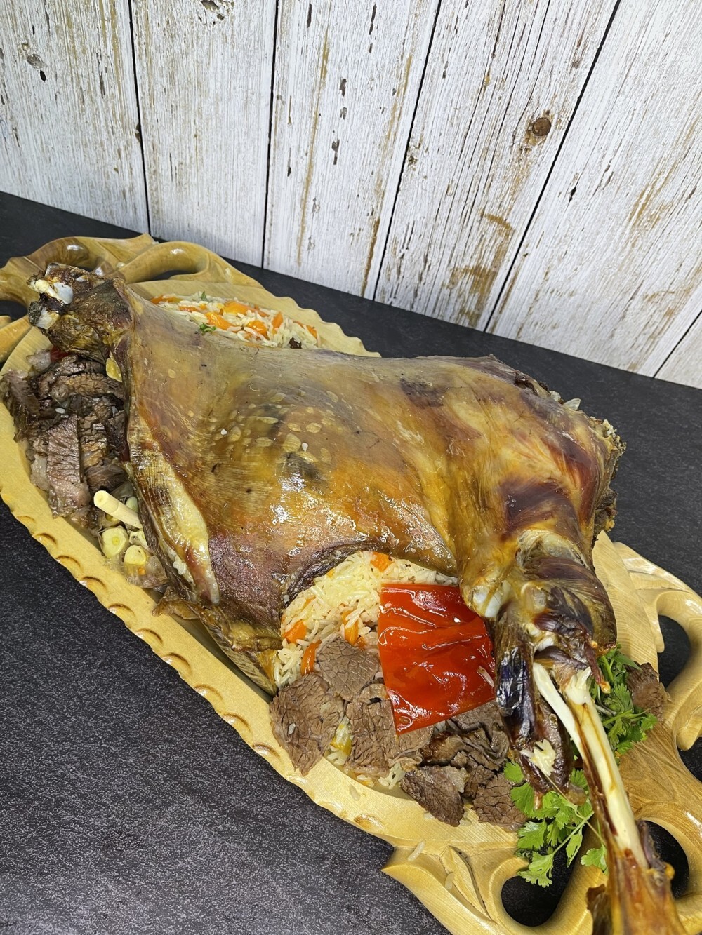 Бараний бок фаршированный пловом и запечёный в тандыре+ дополнительно плов с говядиной 4 кг. На 10+ персон.