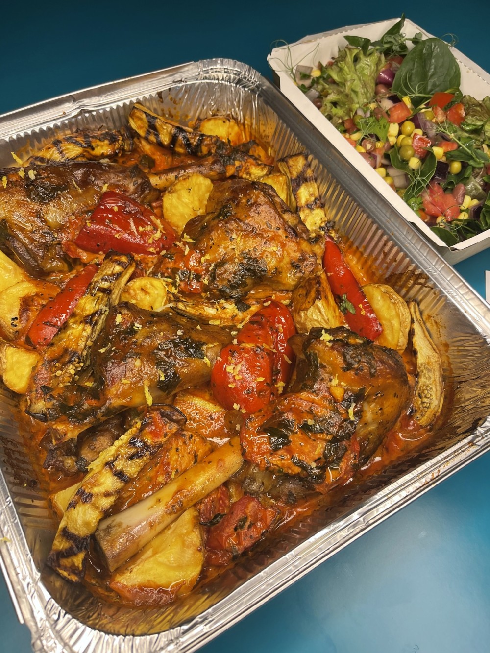 Лытки ягнёнка, длительного томления в печи, с овощами и картофелем. Салат из сезонной зелени.