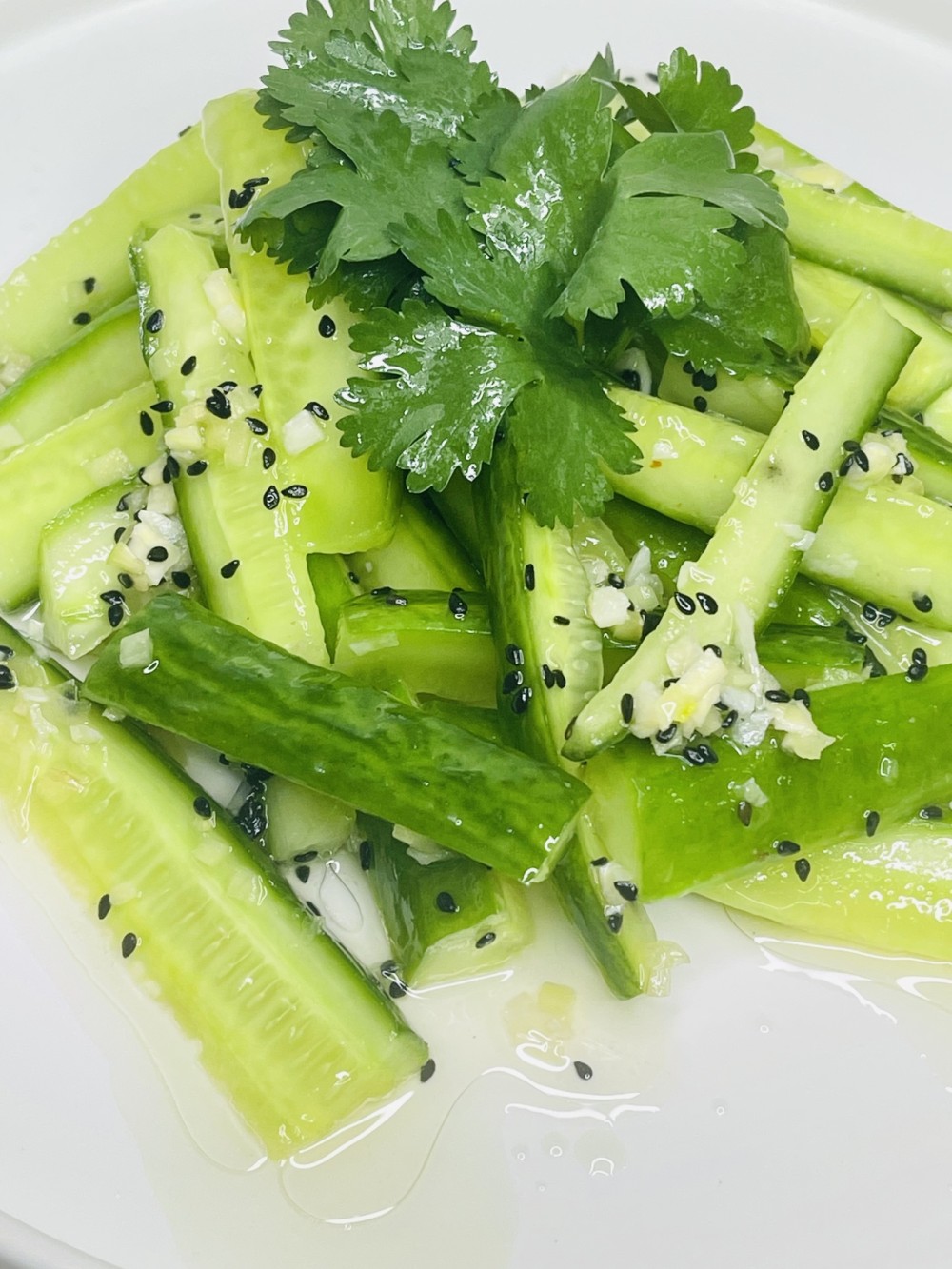 Огурцы, имбирь, кинза, чесночное масло,