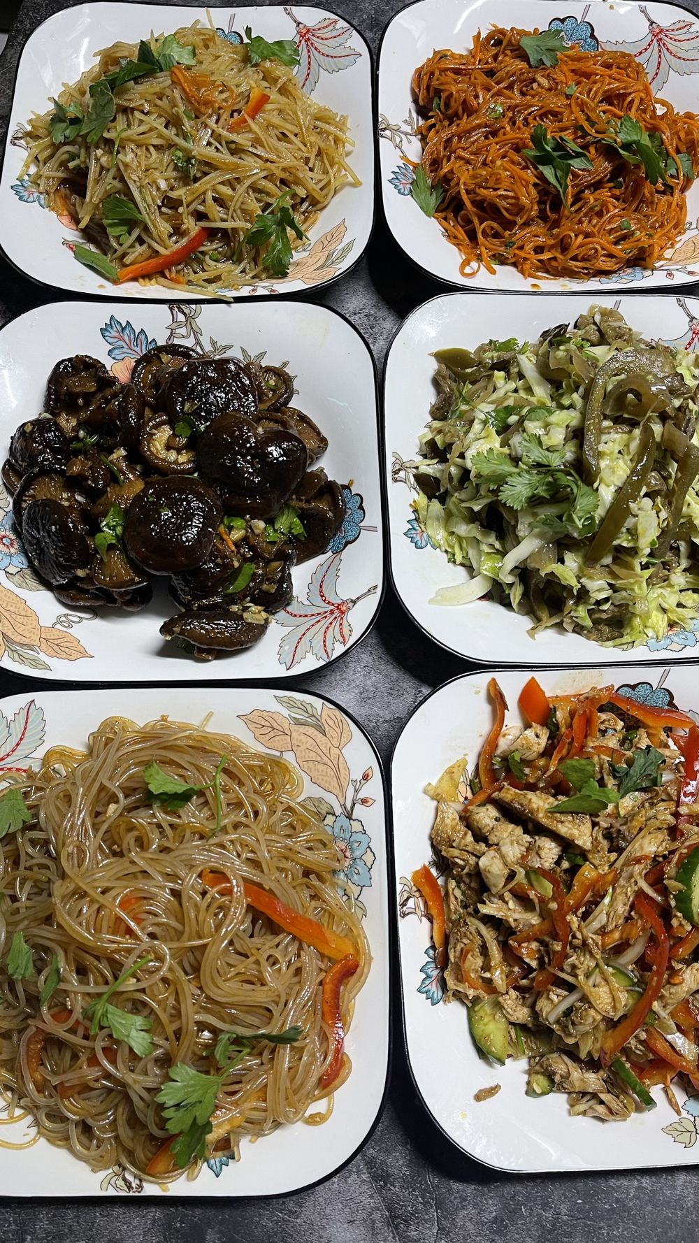 1.Хе из курицы 2. Салат из моркови 3. Салат из Грибов 4. Из капусты и баклажан. 5. Фунчоза 6. Салат из картофеля