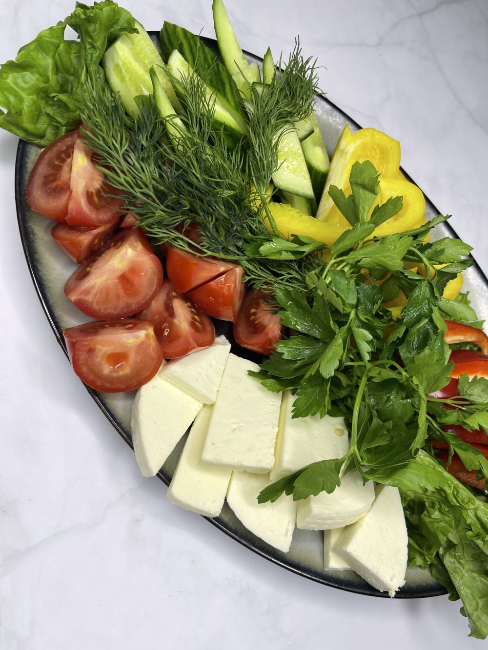 Брынза, томаты, огурцы, сладкий перец, зелень.