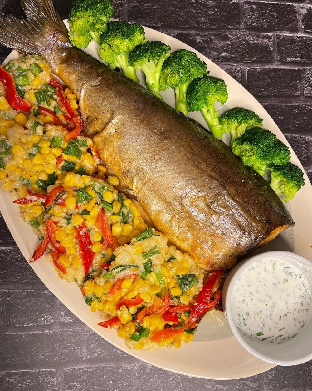 Горбуша( красная рыба) запеченая 1+ кг. Гарнир из брокколи и бакван султан ( блинчики из сладкой кукурузы, зеленого лука и сладкого перца), чесночно-сливочный соус.