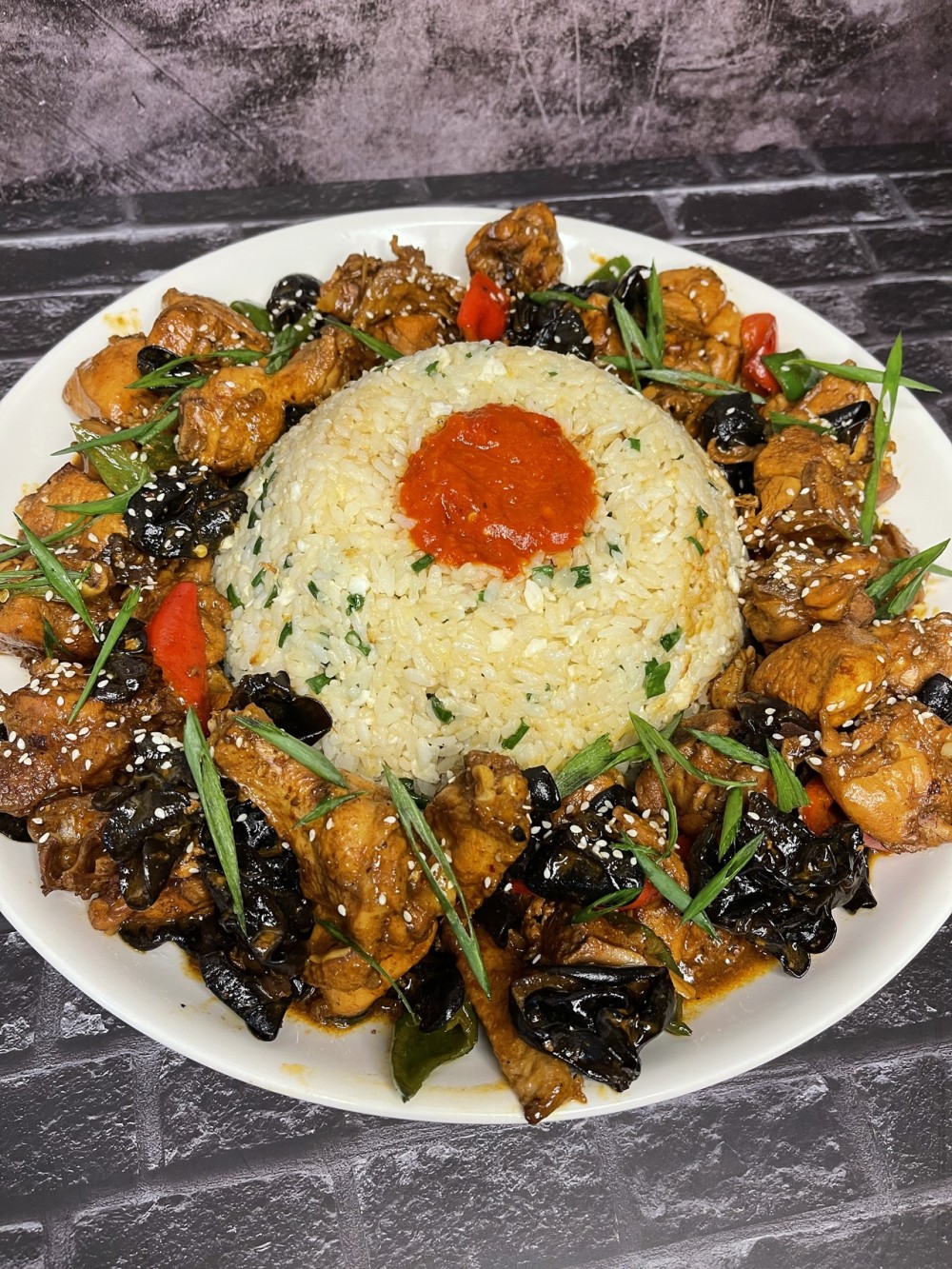 Китайское домашнее блюдо средней остроты. Домашняя курица тушёная по китайски, рис жареный с зеленым луком и яйцом. Это блюдо так же готовиться на 10 персон и бооее. См. раздел китайской кухни.
