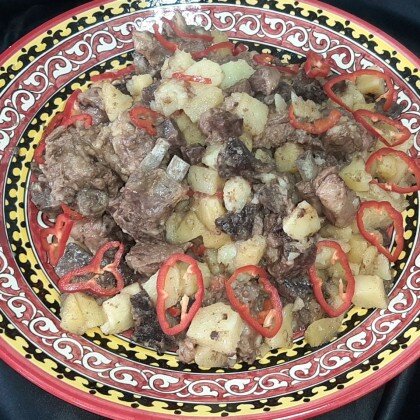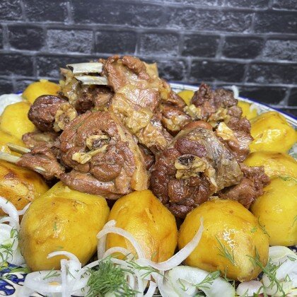 Мясо ягнёнка тушеное в собственном соку 4-5 часов с картрофелем. 2 кг. мяса и 2 кг. картофеля.