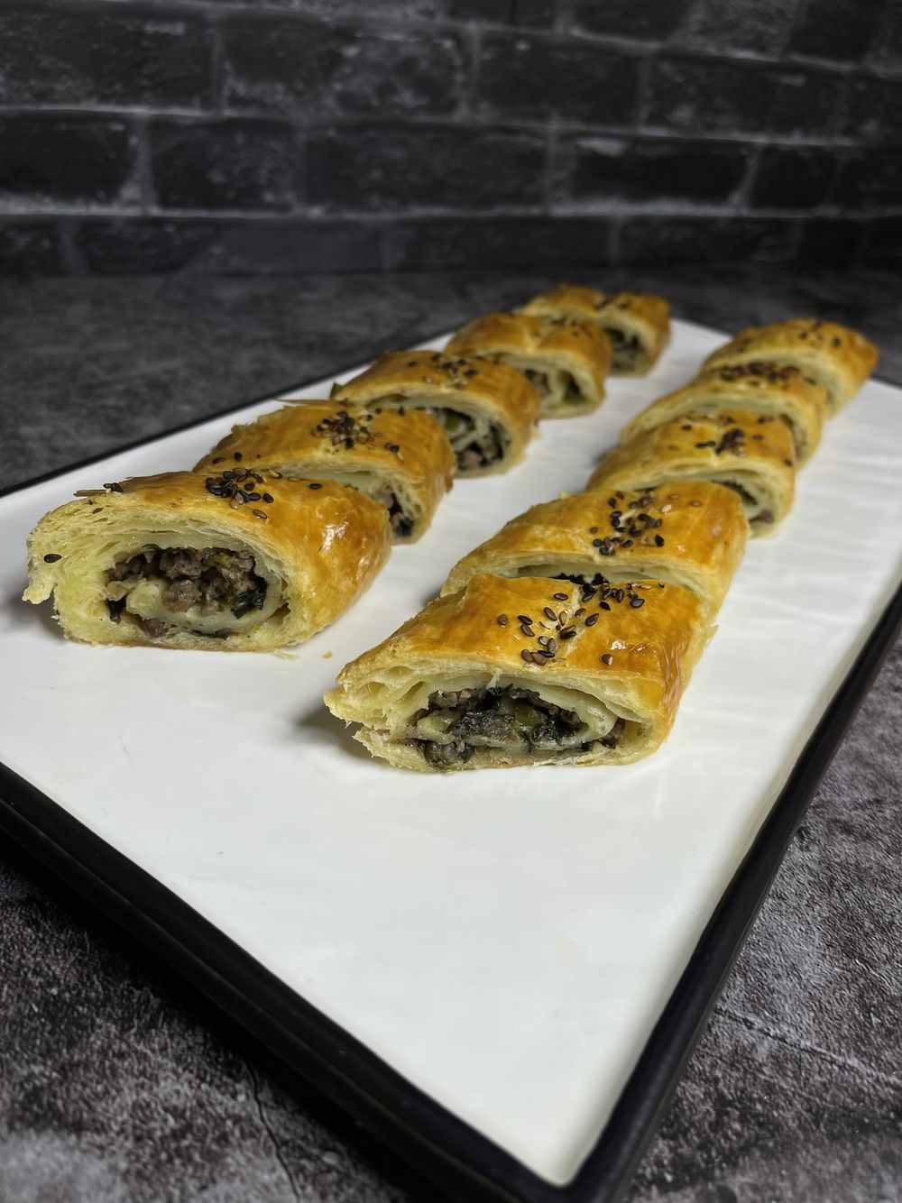 Рулетики из слоёного теста с говядиной и шпинатом.