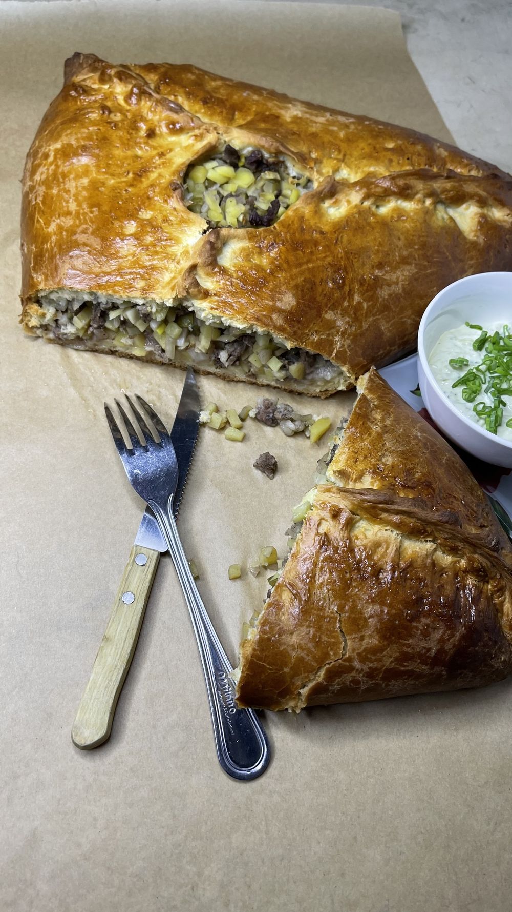 Большой мясной пирог из слоёного теста на 30+ персон.