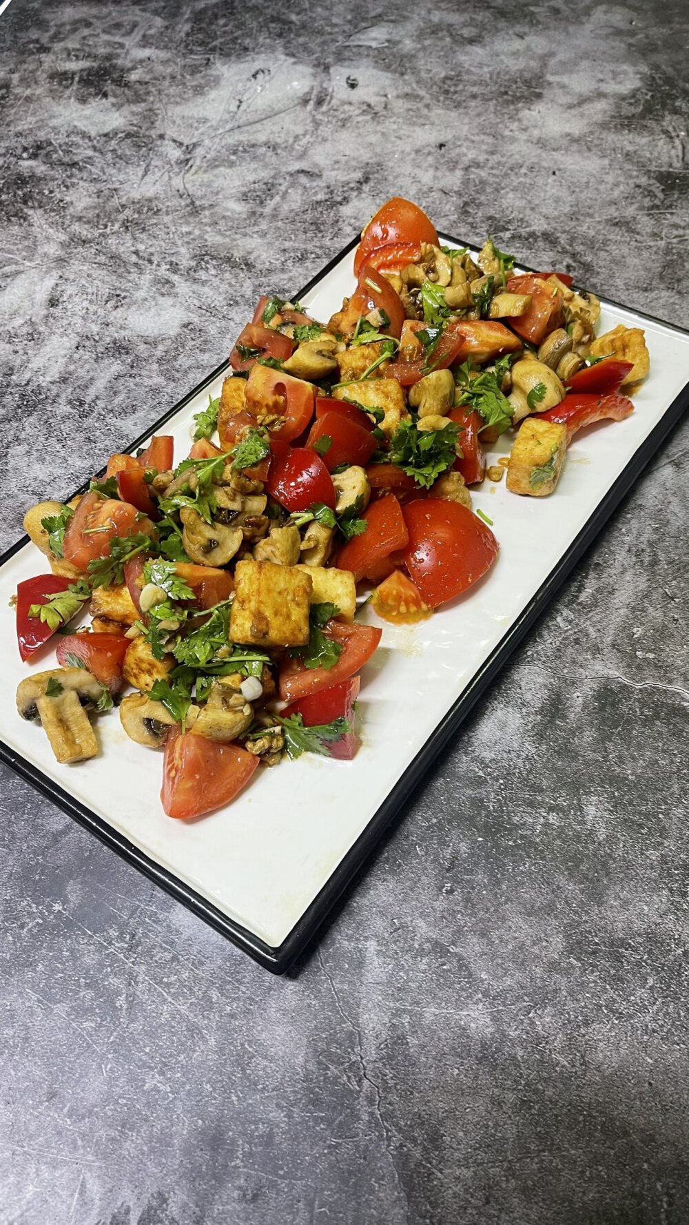 Брынза, шампиньоны, грецкие орехи, помидоры, болгарский перец, чеснок, кориандр, бальзамический уксус, масло
