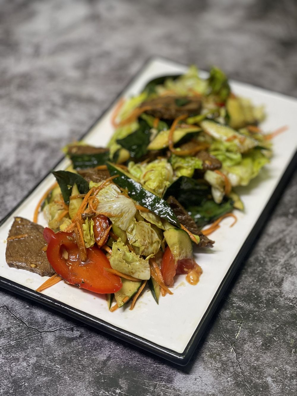 Отварная, телятина, шпинат, айсберг, огурцы, сладкий перец, полугорький перец , морковь , соевый соус, масло, чеснок, специи, рисовый уксус, соус свит Чили.