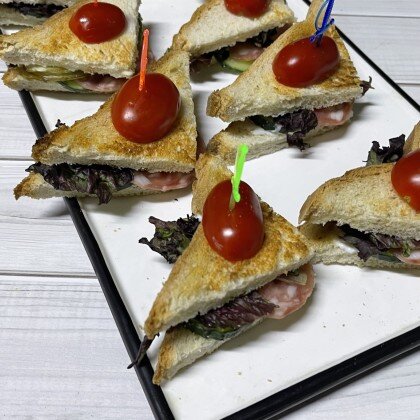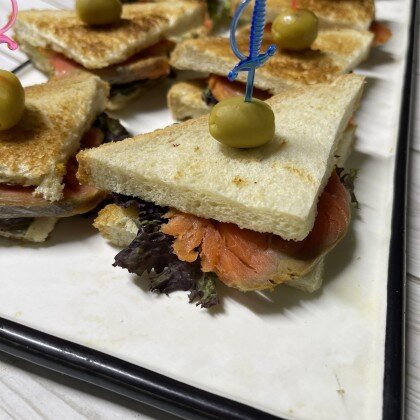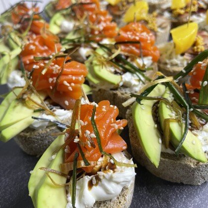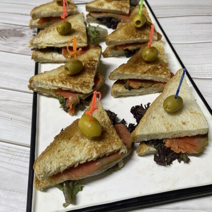 4. Канапе из свежего огурца и копченого лосося на слоеном тосте, крем чиз и икра мойвы.