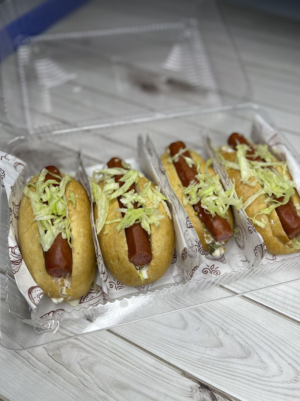 Булка, охотничья колбаска, соус, сладкая горчица, маринованные огурцы, айсберг.