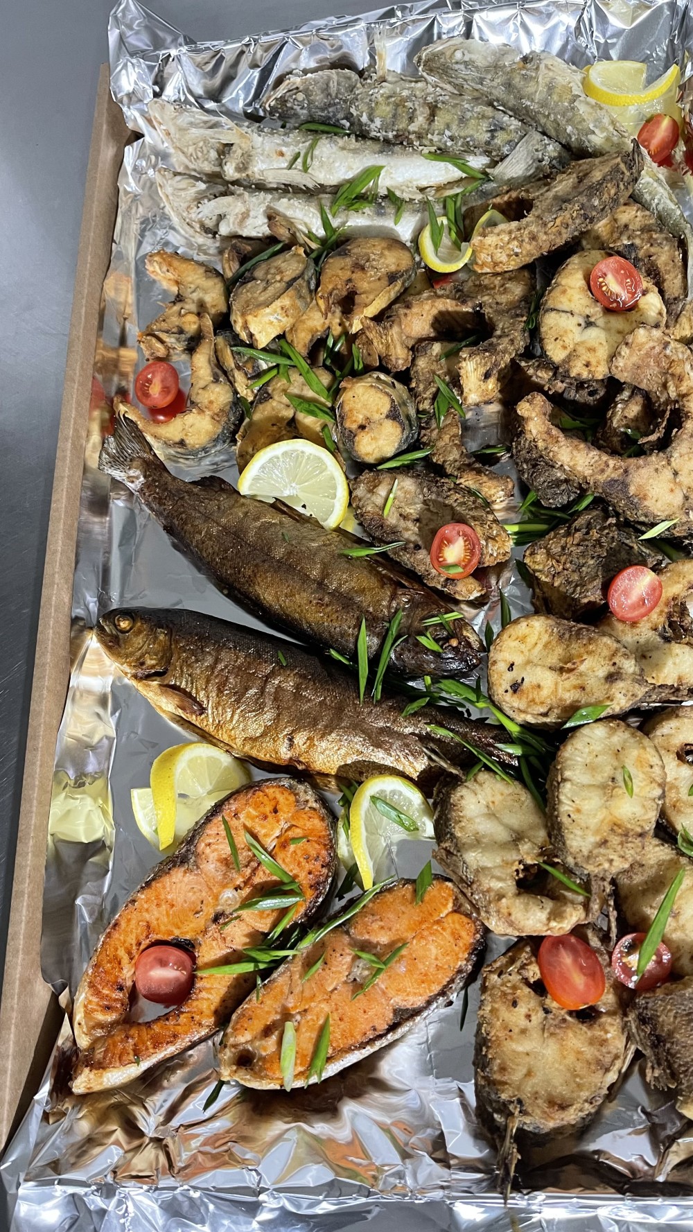 1. Судак жареный 1 кг. 2. Сазан жареный 1,5 кг. 3. Скумбрия жареная 500 гр. 4. Стейки лосося запечные 500 гр. 5. Берши жареные 1 кг. 6. Форель запечёная 2 шт. 600 гр.