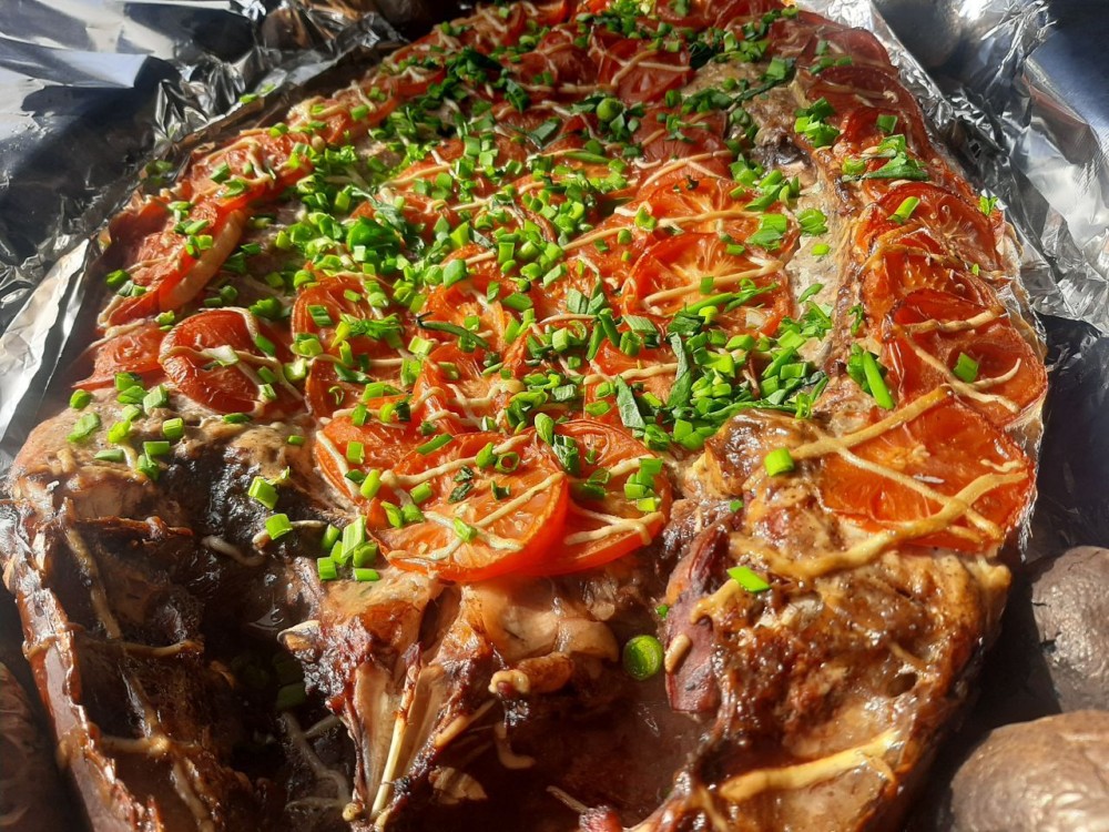 Сазан весом 3 кг., приготовленный в коктальнице на вишнёвых щепках с печёным картофелем