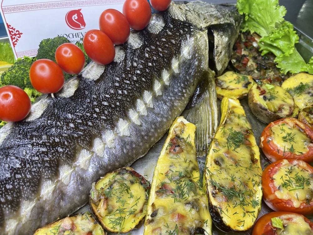 Осётр весом 7 кг. , запечённый по-царски с фаршированными овощами и рисом на гарнир.