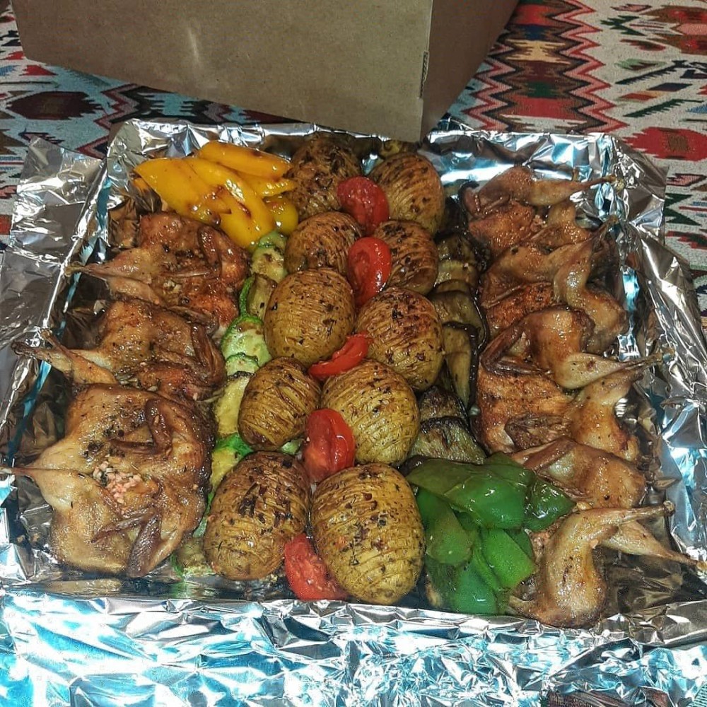 8 перепелок, картофель печеный с чесноком и розмарином, овощи гриль, соус аштарак, красный соус. На 8 персон.
