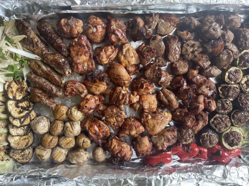 ✅ 6 палочек баранины ✅ 6 палочек курицы ✅ 2 палочки крылышек ✅ 2 палочки печени ✅ 2 палочки индейки ✅ 2 палочки шампиньонов ✅ 2 палочки овощей ✅ Лаваш ✅ Соус ✅ Маринованный лук