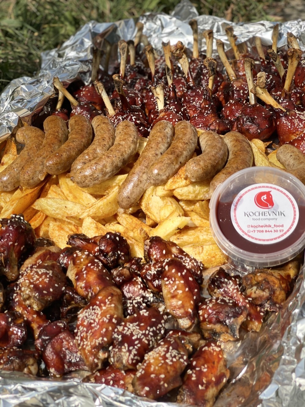 ✅ 30 ножек лолипопс ✅ 40 крыльев буффало ✅ 10 колбасок гриль ✅ 2 кг. картофельных долек ✅ Овощи гриль ✅ 500 мл. соуса BBQ